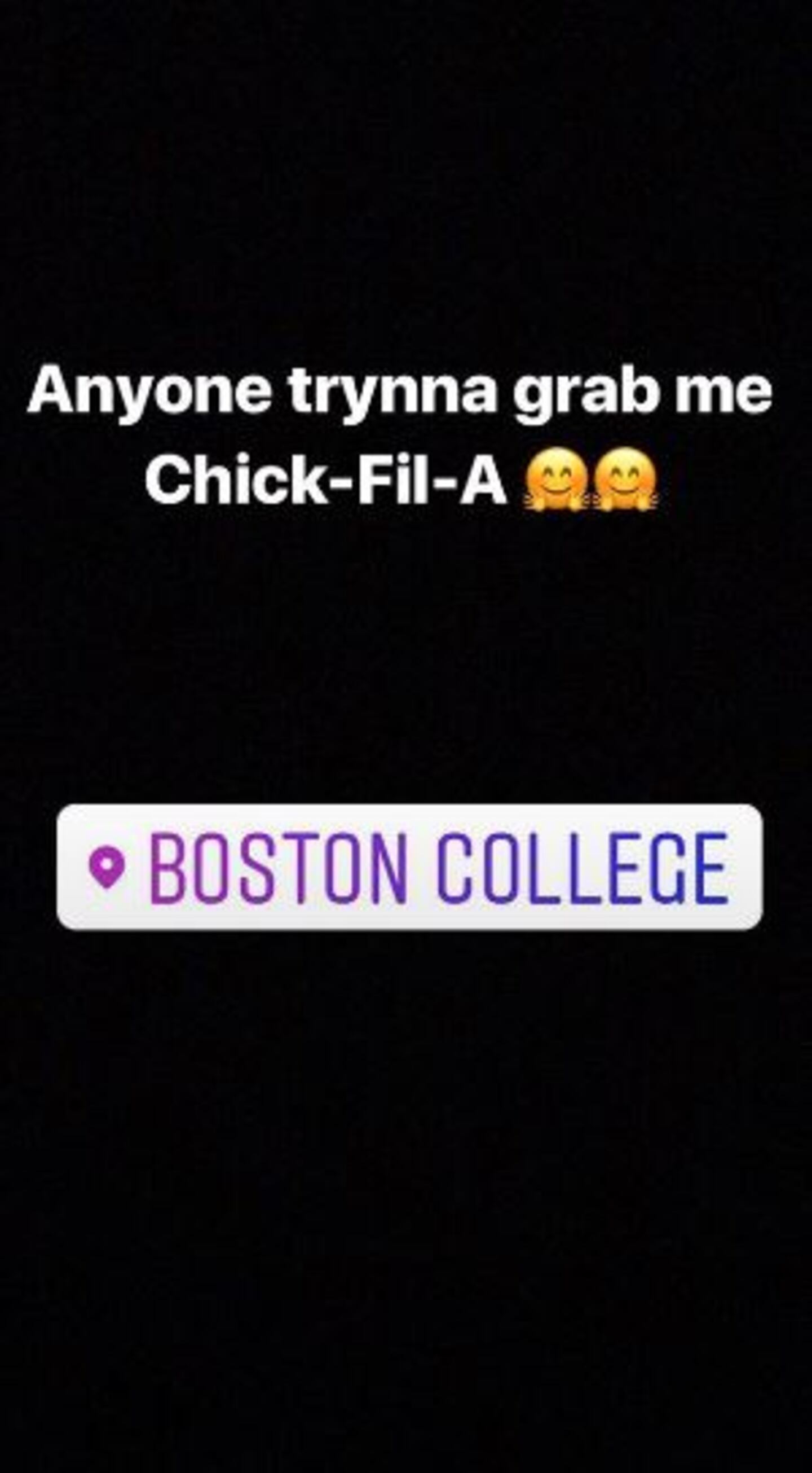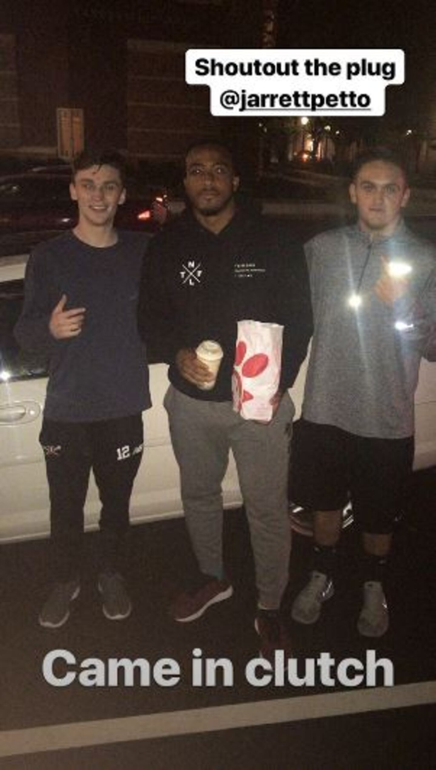 "Jarrett called me and told me and I didn't believe him," said Kelley. "But we started a back and forth with AJ on instagram and we decided to do it. So Jarrett picked me up and we went to the Dedham Chick-fil-A and bought his food. We then drove to BC and pulled up outside of his dorm. Dillon saw us, came outside and we gave him his order"