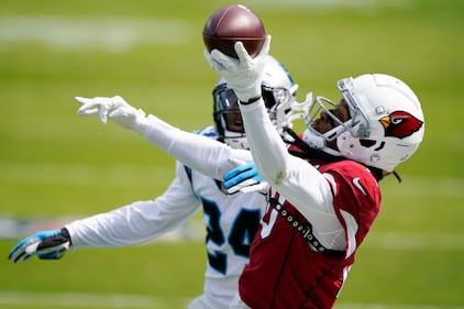 Photos: Carolina Panthers vs. Arizona Cardinals Arizona Cardinals wide receiver DeAndre Hopkins catches a pass over Carolina Panthers cornerback Rasul Douglas during the first half of an NFL football game Sunday, Oct. 4, 2020, in Charlotte, N.C. (AP Photo/Brian Blanco) (Brian Blanco/AP)