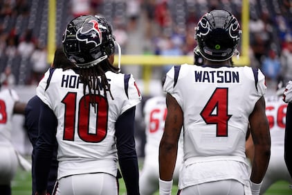 Houston Texans wide receiver DeAndre Hopkins (10) and quarterback Deshaun Watson (4) watch during warmups before an NFL football game against the New York Giants Sunday, Sept. 23, 2018, in Houston. (AP Photo/Eric Christian Smith)